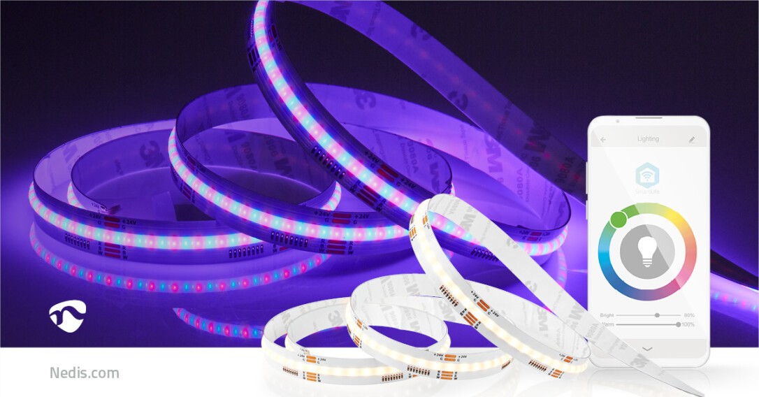Dieser ultradünne COB-LED-Streifen von Nedis kann in jedem Raum im ganzen Haus verwendet werden. Steuern Sie ihn in der Nedis SmartLife-App, legen Sie Zeitpläne oder Automatisierungen fest oder regeln Sie mit Ihrem Sprachassistenten die Helligkeit dieses COB-LED-Streifens. Er wird direkt mit dem WLAN verbunden, ein separater Hub ist nicht erforderlich.Das Farbschema dieses COB-LED-Streifens umfasst warm- bis kaltweiß sowie RGB-Farben, sodass es ganz einfach ist, die bevorzugte Farbtemperatur in der Nedis SmartLife App einzustellen.Durch seine Vielseitigkeit kann dieser COB-LED-Streifen auf unterschiedlichste Weise in Ihrem Zuhause angebracht werden. Das Produkt hat eine Länge von 2 Metern und kann ganz nach Ihrem persönlichen Bedarf gekürzt werden.Das doppelseitige Klebeband (3M) ist bereits platziert und erleichtert die Installation auf allen sauberen und ebenen Oberflächen.