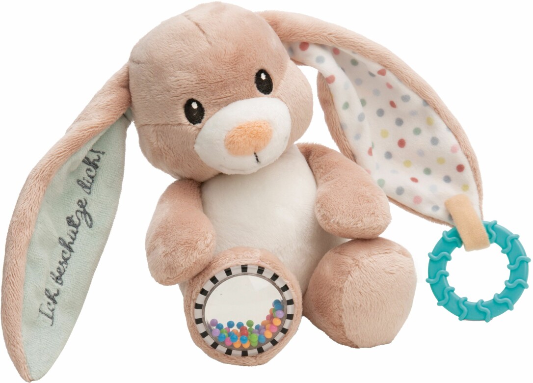 Schutzengel Hase Fjella ist nicht nur ein bezauberndes Kuscheltier, sondern auch ein spannendes Activity-Tier, das die Neugier und den Entdeckerdrang jedes Babys weckt. Mit seinem hellbraun-beigen Plüschfell und den langen Schlappohren eignet sich Fjella nicht nur zum Kuscheln, sondern bietet auch zahlreiche Spielmöglichkeiten, die kleine Entdecker begeistern und beschäftigen. Am linken Ohr des Hasen befindet sich ein praktischer Beißring, der ideal für zahnende Babys ist. Er verschafft Linderung bei schmerzendem Zahnfleisch und sorgt gleichzeitig für spannende Greif- und Kauerlebnisse. Im rechten Fuß versteckt sich eine Rassel mit einem kleinen Spiegel und bunten Perlen, die beim Schütteln fröhliche Geräusche macht und visuelle Reize bietet. Im linken Fuß hat Fjella ein Glöckchen, das sanfte Töne von sich gibt und die Aufmerksamkeit des Babys auf sich zieht. Und als wäre das noch nicht genug, versteckt sich im rechten Ohr, das mit dem Schriftzug Ich beschütze dich!'' bestickt ist, Knisterpapier, das bei Berührung ein aufregendes Geräusch erzeugt ideal, um die taktile Wahrnehmung zu fördern. Schutzengel Hase Fjella ist somit der perfekte Begleiter für Babys, denn er verbindet Kuscheln mit jeder Menge Spielspaß. Ein ideales Geschenk zur Geburt oder Taufe, das Freude bereitet und die Entwicklung fördert.''