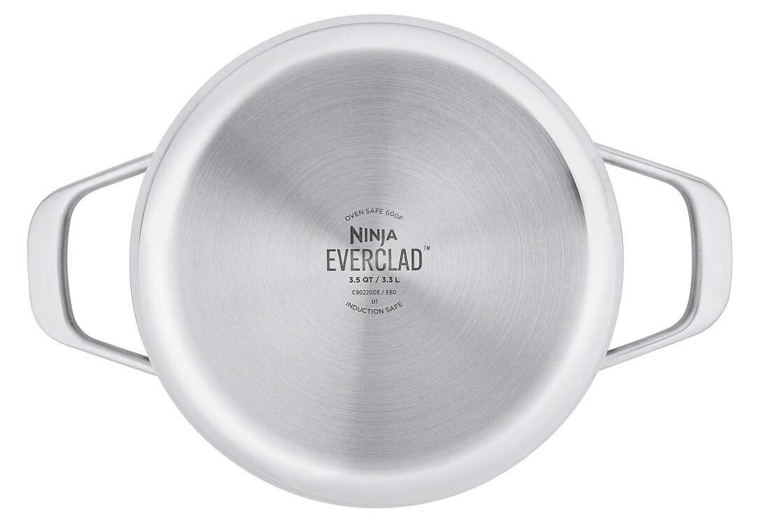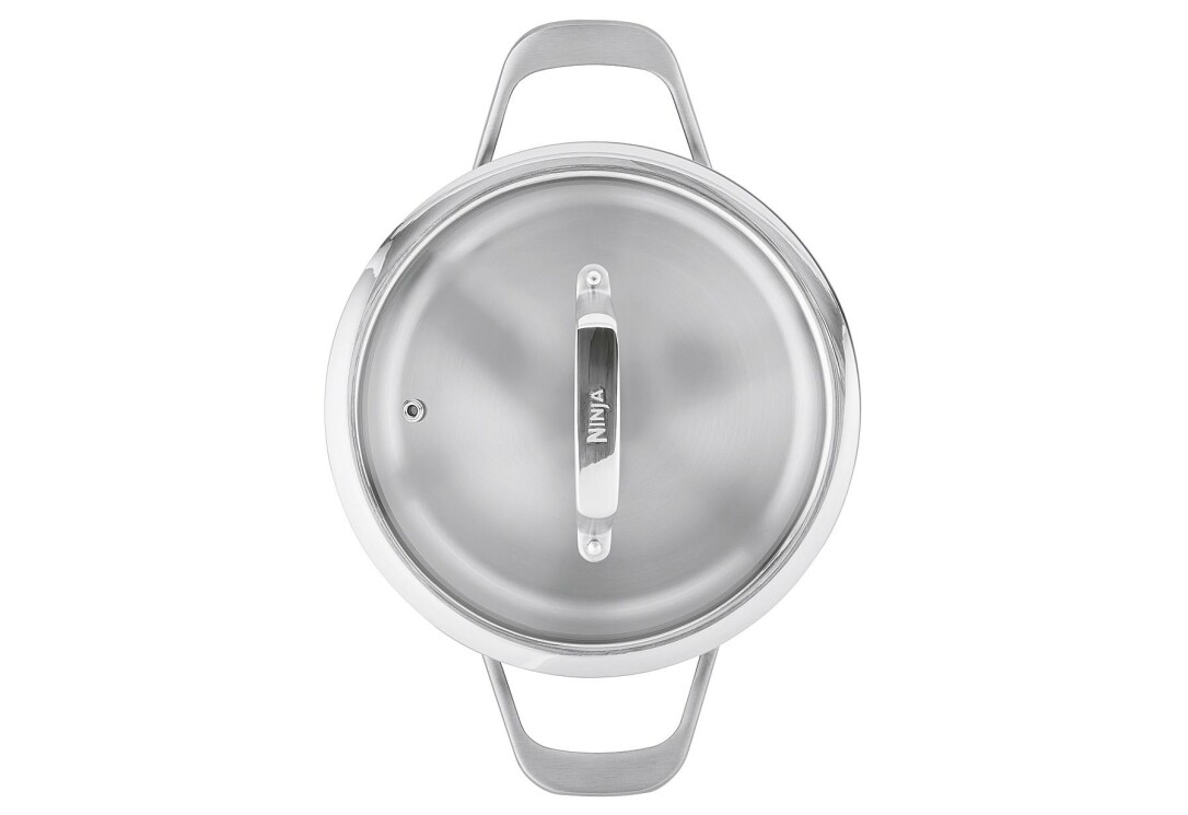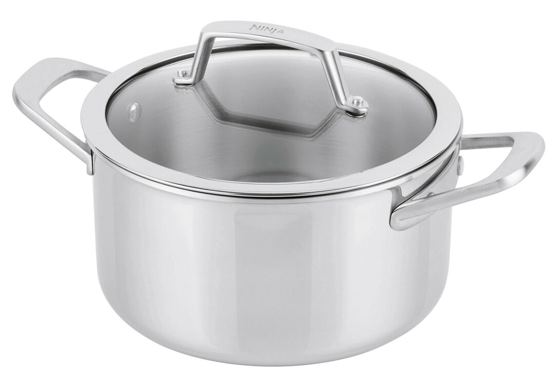 NINJA Bratentopf "EverClad" Ø 20 cm aus Edelstahl mit Glasdeckel. Fassungsvermögen 3,3 l. Für alle Herdarten geeignet, kompatibel mit Ø 17 cm Induktionsring. Ofenfest bis 315 °C, spülmaschinengeeignet.