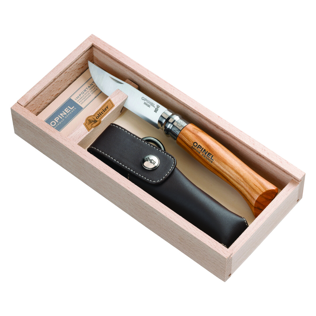 Opinel Geschenkbox N°8 Olivenholz - In attraktiver Holzbox und mit Kunstleder-Etui - Aus hochwertigen Olivenholz - Rostfreier hochlegierter Kohlenstoffstahl - Mit Sicherheitsring zum arretieren
