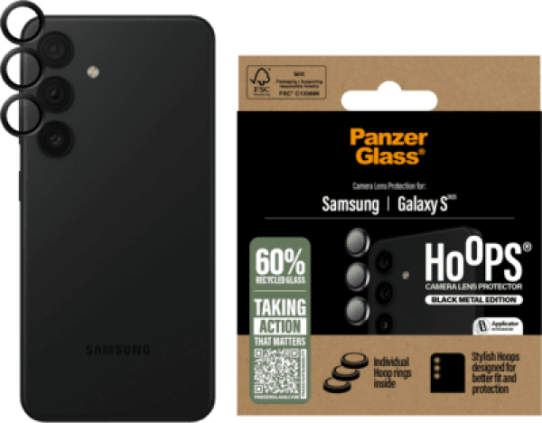 PanzerGlass ® Hoops® Schwarz Kameraschutz Samsung Galaxy S25, Samsung, Samsung - Galaxy S25, Trockene Anwendung, Kratzresistent, Schockresistent, Schwarz, 1 Stück(e)