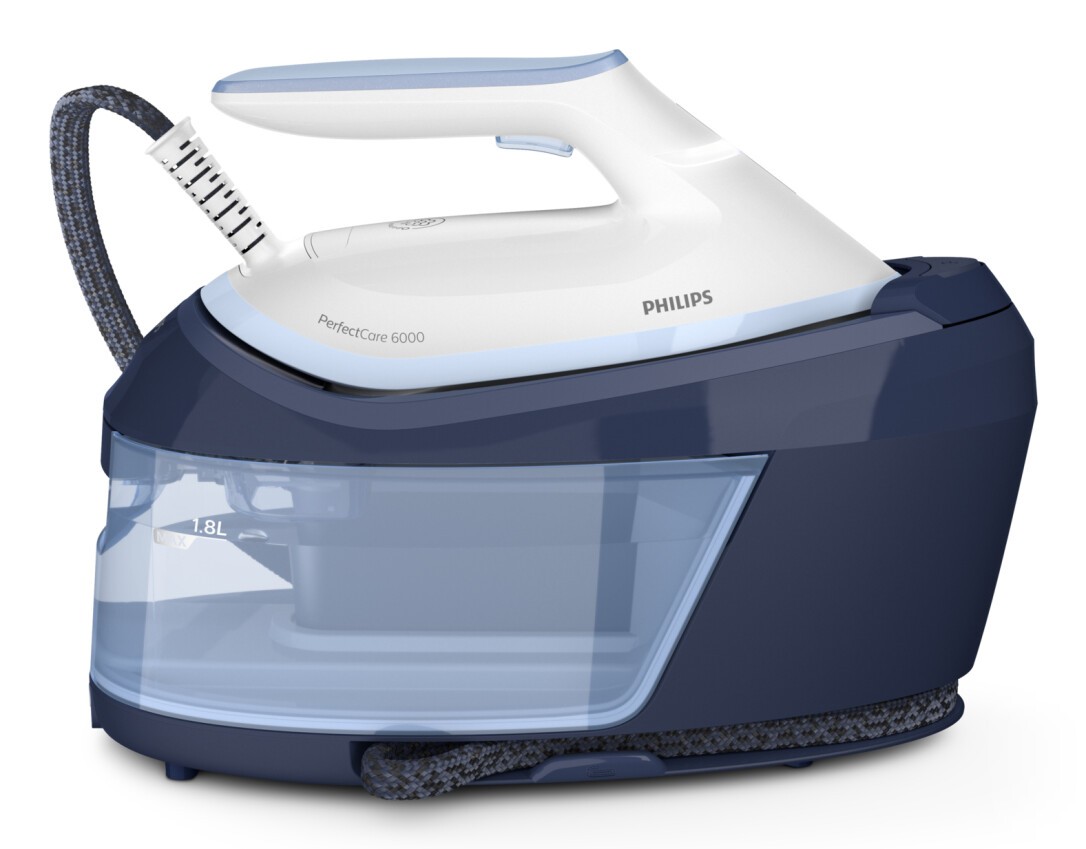 Philips 6000 series PerfectCare PSG6026/20 Dampfbügelstation. Bügeleisen-Wattleistung: 2400 W, Dampfstoßleistung: 500 g/min, Material Bügelsohle: SteamGlide Plus-Sohle. Energieeinsparung: 30%. Kabellänge: 1,65 m, Schlauchlänge: 1,6 m, Schnur-Befestigungssystem: Velcro fix. Breite: 168 mm, Tiefe: 368 mm, Höhe: 269 mm. Max. Leistung: 2400 W, Garantiezeit: 2 Jahr(e), Ursprungsland: Vereinigtes Königreich