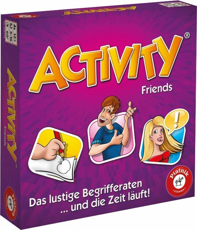 Activity Friends ist ein neues Spiel für die ganze Familie. Neue Begriffe und ein rasanter Spielverlauf sorgen für Spielspaß und gute Unterhaltung. Das Spiel ist geeignet ab 12 Jahren. Piatnik Activity - Friends Lachsalven, Aktionen mit Händen und Füßen... und die Zeit läuft! 1760 Begriffe müssen so umschrieben werden, pantomimisch dargestellt oder gezeichnet werden, dass sie von den Mitspielern in nur 60 Sekunden erraten werden. Details: für 3-16 Spieler ab 12 Jahren Spieldauer: ca. 45 Minuten