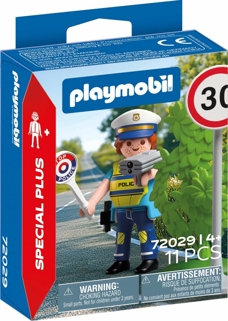 PLAYMOBIL Special Plus Polizist mit Radar. Versteckt im dichten Gebüsch am Straßenrand lauert der clevere PLAYMOBIL-Polizist mit seinem mobilen Radargerät. Hochkonzentriert misst er die Geschwindigkeit der vorbeibrausenden Fahrzeuge bereit, jeden Raser zu stoppen!
