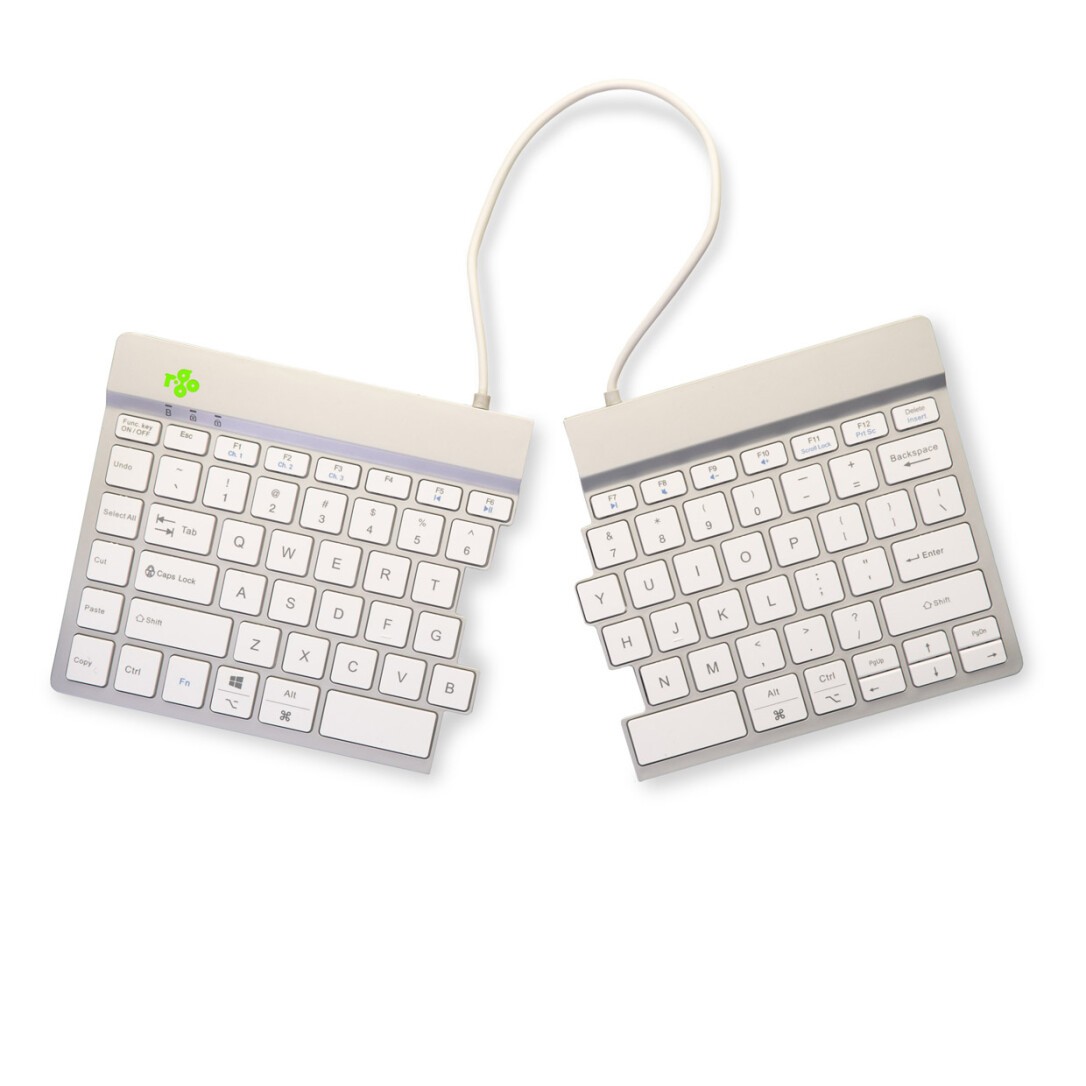R-Go Tools Ergonomische Tastatur R-Go Split Break mit Pausensoftware, ergonomische geteilte Tastatur, QWERTY (US), kabellos, weiß. Übertragungstechnik: Kabellos, Geräteschnittstelle: Bluetooth, Tastaturaufbau: QWERTY. Kabellänge: 1,5 m. Empfohlene Nutzung: Büro. Produktfarbe: Weiß