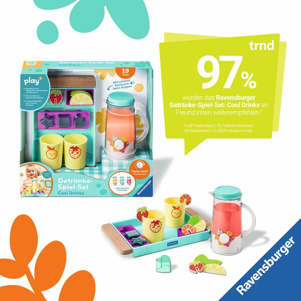 Apfelschorle, Eistee oder Zitronenwasser? Die Karaffe leuchtet je nach Getränkewunsch in verschiedenen Farben und macht lustige Gießgeräusche. Mit jeder Menge Zubehör und Deko bietet das Set alles, was man für leckere Getränke und ein fantasievolles Rollenspiel braucht. Der Eiswürfelbehälter lädt nebenbei auch noch zum Formensortieren ein. Und mit dem praktischen Tablett kann alles transportiert und auch wieder aufgeräumt werden. Play+, die neue Baby- und Kleinkindlinie, fokussiert auf eine ganzheitliche frühkindliche Förderung mit der gesamten Erfahrung der Marke Ravensburger.Die abwechslungsreichen Bücher und Spielzeuge von Play+ garantieren Kindern von 0-3 Jahren jede Menge Spaß und ermöglichen ein spielerisches Lernen und Entdecken egal ob gemeinsam oder auch allein.Die Bedürfnisse der Kinder und die Anforderungen der Eltern bestimmen die Entwicklung aller Produkte. Der Blick fürs Detail, das besondere Extra und eine moderne Gestaltung machen das Programm von Play+ aus, immer unter Einhaltung der hohen Ravensburger Sicherheits- und Qualitätsansprüche. Denn sicher ist sicher.