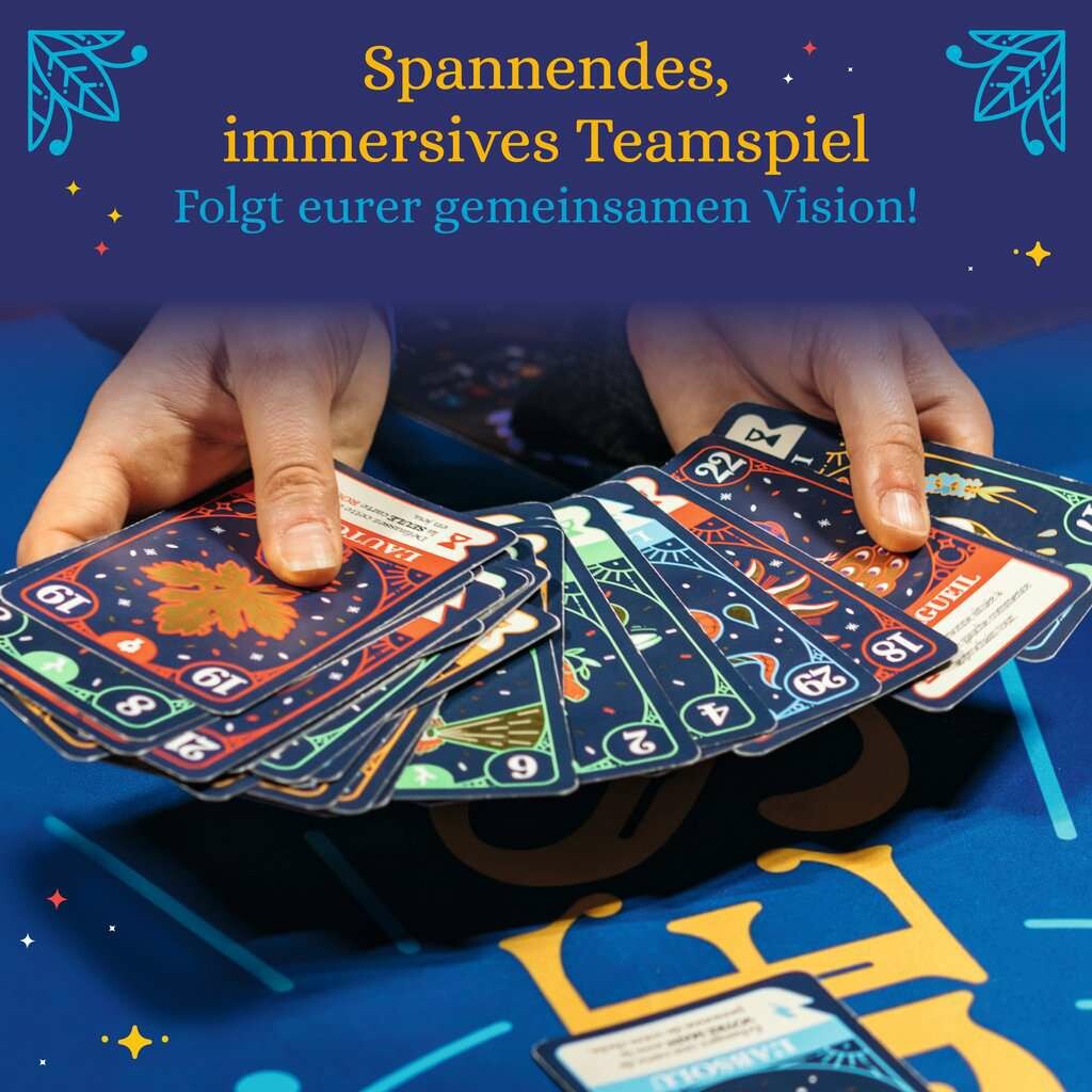 In diesem Kartenspiel liegt die Zukunft eures Teams liegt in euren Händen. Folgt eurer gemeinsamen Vision und spielt eure Karten geschickt aus. Wer nur noch eine Karte hat, gewinnt den Durchgang für das eigene Team. Doch wer darf Karten ablegen und wer muss wieder Karten zurück auf die Hand nehmen? Das wissen nur die Karten. Ein Team gewinnt, wenn es zwei Durchgänge gewonnen hat. Um das zu erreichen müssen alle ihre Karten geschickt zum richtigen Zeitpunkt ausspielen. Nach jeder Runde werden die ausgespielten Karten mit ihren 30 einzigartigen Effekten ausgewertet. Nur das Team, das eine wirklich gemeinsame Vision hat ohne sich abzusprechen, kann die Zukunft für sich gewinnen.