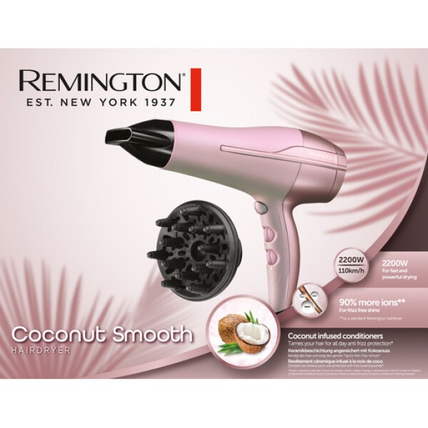 Der Coconut Smooth Hairdryer sorgt für ein wunderschönes Föhnergebnis mit ganztägigem Frizz-Schutz. Der fortschrittliche Conditioning-Ring mit Kokosnuss-Micro-Conditioner sorgt für lang anhaltende, geschmeidige Ergebnisse und schützt Ihr Haar vor der täglichen Feuchtigkeit. Mit Ionic Conditioning mit Ionen und einer Leistung von 2200 Watt erzielen Sie schnelle und kraftvolle Trocknungsergebnisse mit kräuselfreiem Glanz.
