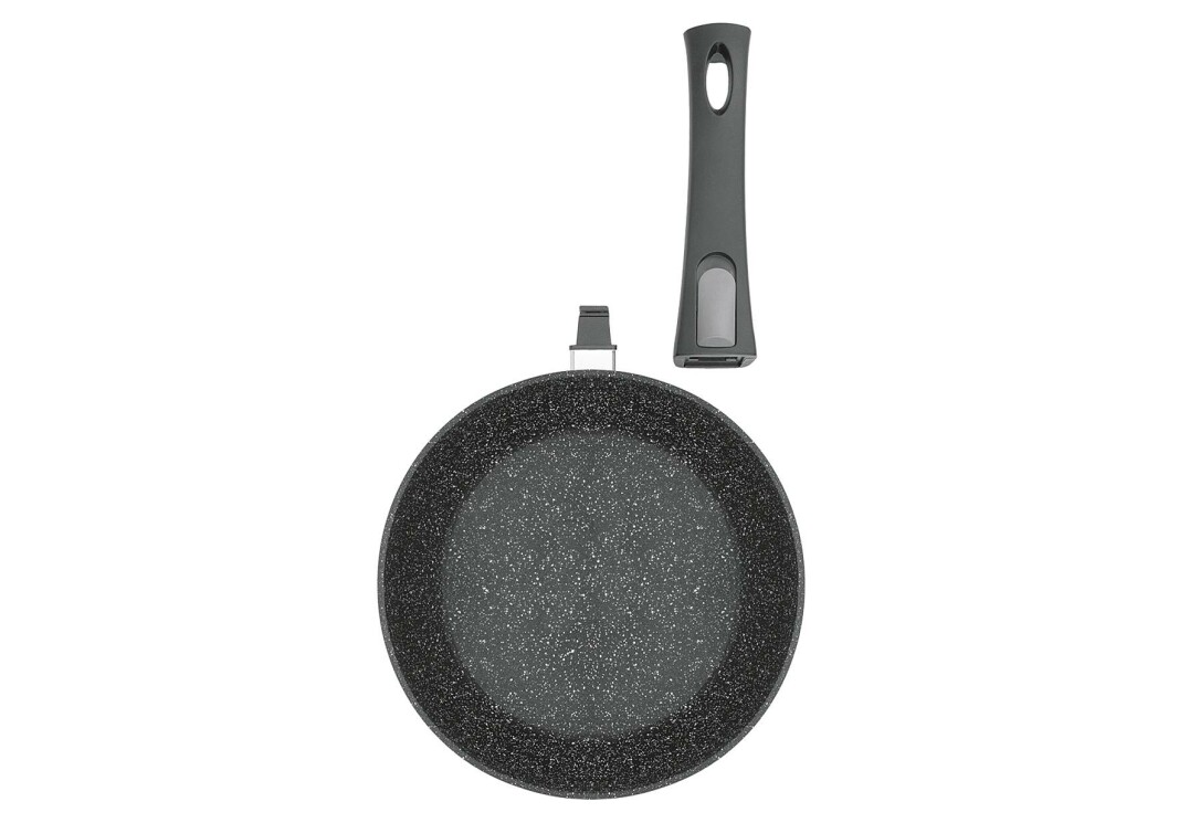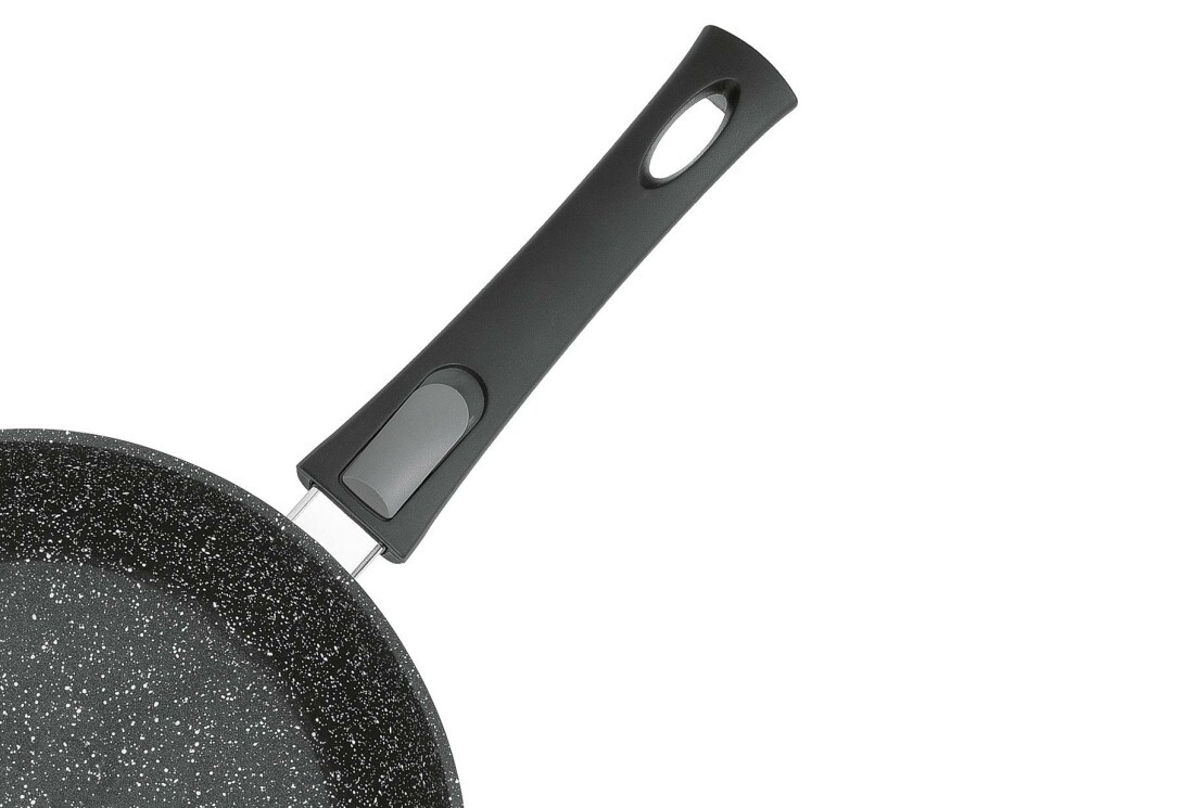 Die Aluminiumpfanne ist mit einer PFLUTON-Marmor Antihaft-Beschichtung ausgestattet. Die Pfane ist auf allen Herdarten einsetzbar und dank des abnehmbaren Griffs kann sie sogar bis 200C im Backofen verwendet werden.
