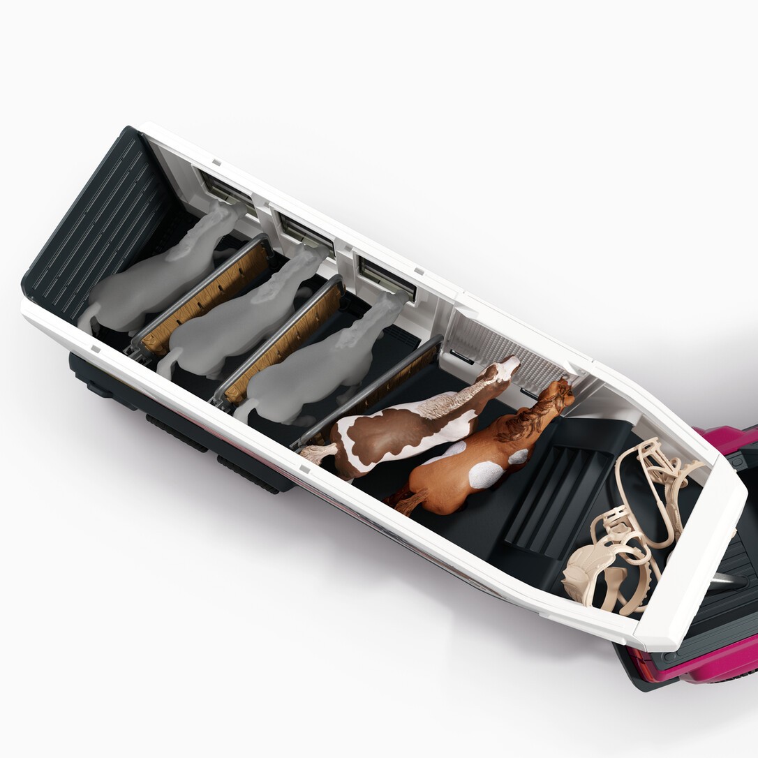 Der coole Lakeside Truck mit dem großen Anhänger ist mal wieder unterwegs. Hannah und Mr. Kramer freuen sich schon: Sie fahren zu einem Western-Abenteuer mit dem Quarter Horse Hengst und dem Paint Horse Wallach. Am Morgen haben sie den coolen Dually Truck mit den breiten Doppelreifen mit Sätteln, Zaumzeug, Striegel, Kardätsche, Eimer und Wasserschlauch beladen, damit sie ihre zwei Pferde vor dem Event noch putzen können. Für sich selbst haben sie passend die Cowboy-Hüte eingesteckt. Unterwegs werden sie eine Rast einlegen. Wie praktisch, dass das Dach des Anhängers auch als Unterstand genutzt werden kann. Hannah hat außerdem ein paar Barrels mit Stangen eingepackt. Vor dem Western-Abenteuer hat sie nämlich ein Training eingeplant. Die Labrador Retriever Hündin ist auch mit von der Partie. Auch für sie ist im Anhänger noch genügend Platz. Darin können bis zu fünf Pferde transportiert werden! Yee-haw das Western-Abenteuer kann kommen!