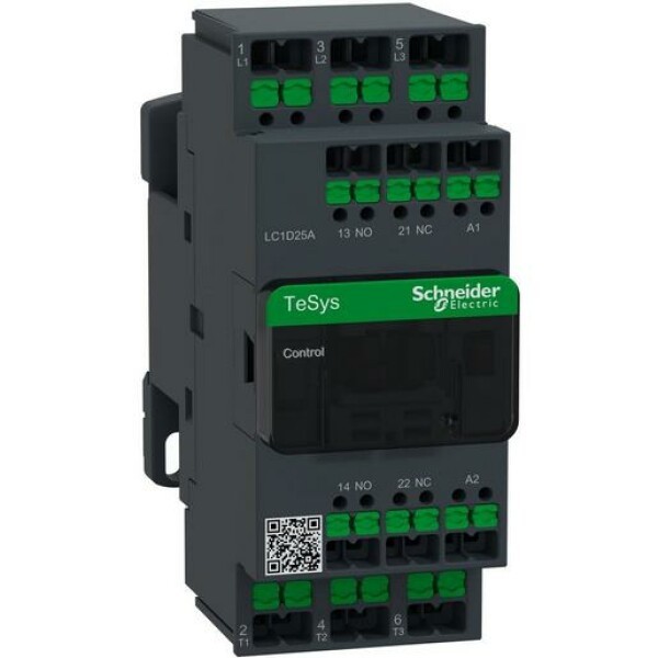 Leistungsschütz TeSys DECA. 3 polig, 3 Schließer. Zusätzliche Hilfskontakte- 1 Schließer + 1 Öffner, Bemessungsbetriebsleistung bei AC-3, 400 V 11 kW, Bemessungsbetriebsstrom Ie bei AC-3, 400 V 25 A, Spule 230 V AC. Abmessung (BxHxT) 45x110x86 mm, Gewicht 0,32 kg. Kategorie AC-3, AC-1, AC-4. ohne integriertes Beschaltungsmodul. Schnelle, sichere und wartungsfreie Stromverbindung mit SnapIN Anschlussklemme. Geeignet für Sicherheitsanwendungen durch mechanisch gekoppelte Kontakte und Spiegelkontakte.
