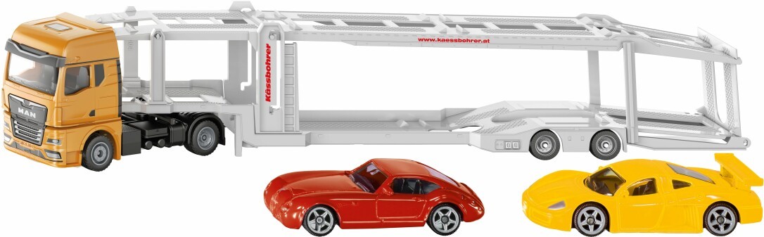 MAN Autotransporter Endlich rollt der schwere Truck auf dem Autohof ein er wird schon sehnlichst erwartet! Auf seiner Duplex-Ladefläche reihen sich die brandneuen Pkw, die jetzt von den neuen Besitzern in Augenschein genommen werden. Die schwere Zugmaschine ist im leuchtenden Gelb gehalten und trägt den MAN Schriftzug. Durch die Fenster kann man in die moderne Fahrerkabine sehen. Der große Anhänger kann im Nu an den Sattelschlepper angehängt werden. Noch schnell die Autos abladen vorsichtig, damit keiner einen Kratzer in den Lack bekommt! Und schon ist der MAN-Transporter wieder einsatzbereit für seine nächste Fahrt. Die Zugmaschine und der Auflieger bestehen aus robustem Zinkdruckguss mit Kunststoffteilen. Der variable Auflieger lässt den Transport von PKW ebenso wie den von Landmaschinen und Baufahrzeugen zu.