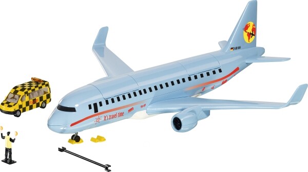 On land, sea, and air: The new commercial aircraft extends the SIKUWORLD with another favourite play subject. Boarding time for flight SW 5402. The large aircraft (38.5 cm) with two powerful engines is ready for boarding. But who is sitting where? The cabin staff just has to raise the front flap in the roof and move the four already seated passengers. The rear flap opens a stowage space for a favourite car, which can be brought along for the holiday. Ready for take-off. The aircraft is at the start position. Full thrust – the plane becomes faster and faster, lifts off, and the undercarriage can be retracted. Get ready for the landing approach: Lower the undercarriage and switch on the landing light. After ten minutes of use, the light goes off automatically. The aircraft has landed, and now an elaborately decorated follow-me vehicle with flashing lights guides it along the runway. With a jolt, the large aircraft is attached to the towbar of the aircraft tractor. The marshaller directs the driver to the final parking position. The perfect complement to the commercial aircraft is the new airport set (item number 6312).