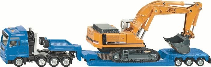 The MAN TG-A in its most impressive format as a 2-axle heavy haulage transporter to 1:87 scale. Design wheel rims with rubber track. Very detailed modelling of exteriors and exhaust to rear of cabin. With coupling system - a 3-axled flat-bed trailer is coupled with swan neck. The flat-bed trailer is fitted with easy-to-manoeuvre mechanics for kids, so it's no problem to decouple it from the swan neck. All this makes for more realistic play, recreating the original loading function. The loading vehicle is a large-scale Liebherr digger with low loader.