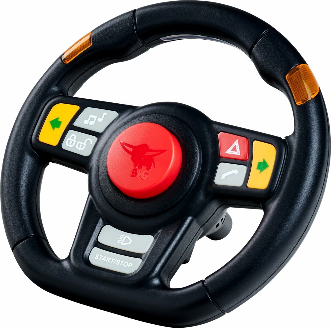 Multifunktionales Lenkrad passend für alle BIG Bobby Cars (Classic, Neo, Next ab Baujahr 2010 sowie BIG Traktoren). Geeignet für Kinder ab 12 Monaten, wasserdicht. 8 verschiedene Sounds, Licht- und Blinkfunktionen sowie Start/Stop-Taste. Verpackt im bunten Stückkarton - Inkl. 3x AAA R03 Batterien.