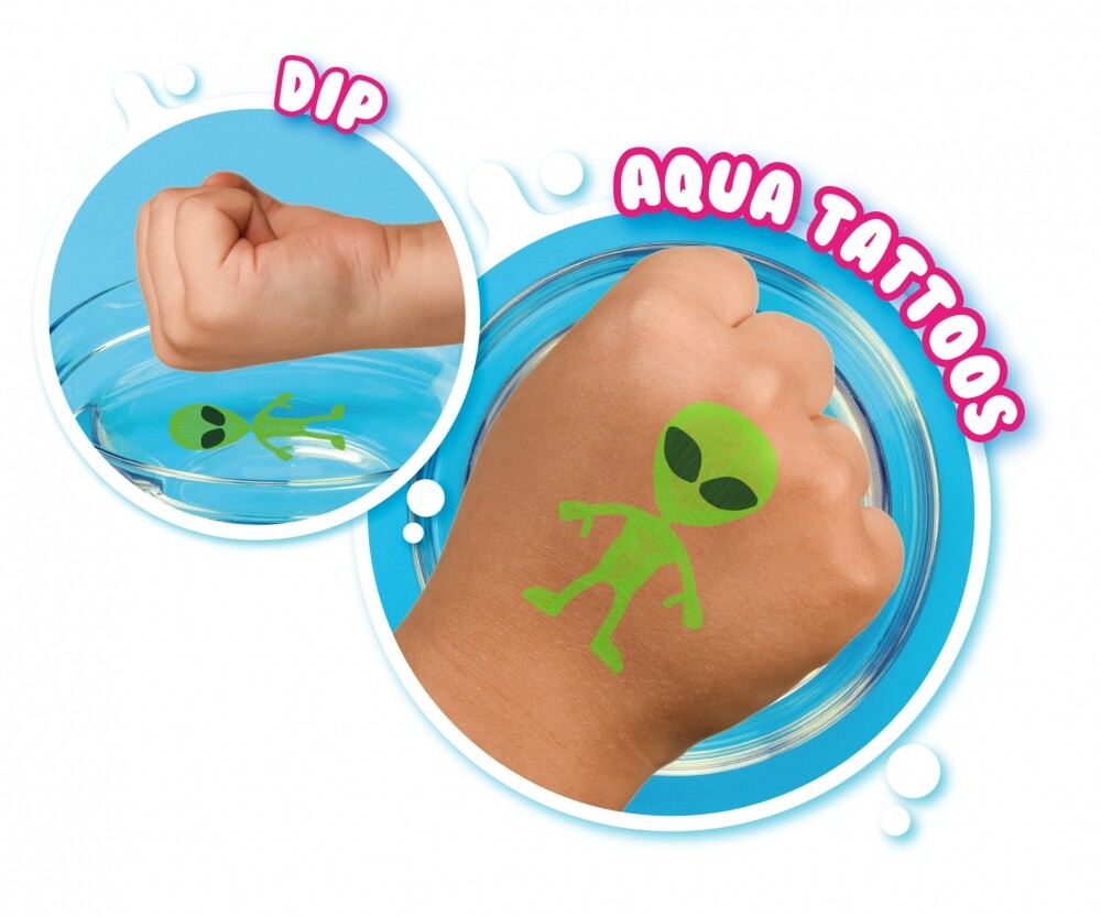# Verwandle jedes Kunstwerk in ein kreatives Tattoo! Mit dem Kreativset für Kinder Doodle N Dip können Kunstwerke mit einer Schüssel voll Wasser zum Leben erweckt werden. # So gehts: Mit 1 von 8 Stiften malst du Figuren und Motive deiner Wahl auf das magische Malpad. Anschließend tauchst du das Malpad nach und nach vorsichtig in eine etwa 10 cm tiefe Wasserschüssel. Die kleinen Kunstwerke schwimmen nun auf der Wasseroberfläche drückst du sie an deine Haut, wird daraus ein cooles, abwaschbares Tattoo!