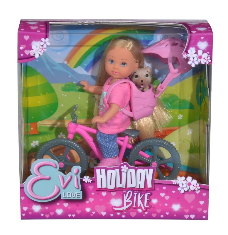 Evi LOVE Ferienspaß Evi geht auf große Reise! Evi liebt es im Urlaub Fahrrad zu fahren und die Gegend zu erkunden. Daher darf in der Ferienspaß Reihe ein Fahrrad Set nicht fehlen. Die vollbewegliche Evi macht auf ihrem pinken Fahrrad mit passenden Fahrradhelm eine tolle Figur. Ein besonderes Highlight ist der pinke Rucksack, in dem ihr süßes Hündchen Platz findet. Dadurch kann sie ihren Tierfreund ganz einfach mitnehmen. Das Fahrrad Set lässt sich auch wunderbar mit dem Ferienspaß Wohnmobil Spielset bespielen und kann auf der Rückseite des Campers dank passender Halterung angebracht werden. Das 5-teilige Evi LOVE Ferienspaß Fahrrad Set von Simba Toys enthält eine vollbewegliche Evi, ein Fahrrad, einen Hund und Zubehör. Geeignet für Kinder ab 3 Jahren. Weitere Spielsets wie Ferienspaß Freunde, Ferienspaß Pferdehof und Ferienspaß Wohnmobil vervollständigen die Ferienspaß Linie und sind separat erhältlich.