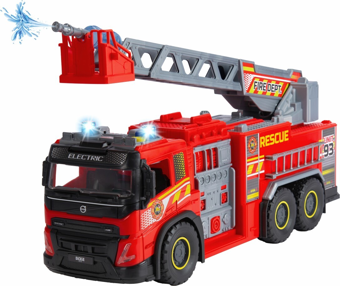 Dickie Toys - Volvo FMX Giant Fire Truck (57 cm) - extra-großes Feuerwehrauto mit Wasserspritze & Leiter, Feuerwehr-Truck für Kinder ab 3 Jahre mit Licht & Sound, inkl. Batterien Riesiges Feuerwehr-Auto - Stolze 57 cm Länge misst diese knallrote Spielzeug-Feuerwehr für Kinder ab 3 Jahren: Und wird die drehbare Leiter ausgezogen, geht der Lösch- oder Rettungseinsatz erst richtig los! Echte Spritzfunktion - Mithilfe der 2 Wassertank-Flaschen und der Wasserkanone auf dem Feuerwehrwagen können die Kids alle Feuerwehr-Abenteuer nachspielen und richtiges Wasser verspritzen. Original Volvo FMX Electric - Als offiziell lizenziertes Volvo Modellauto begeistert das große Feuerwehrfahrzeug die Mädchen und Jungen mit unzähligen Details zum Entdecken und Bestaunen. Coole Extras - Natürlich dürfen bei einem richtigen Feuerwehrauto eine typische Sirene und Blaulicht nicht fehlen. Deshalb ist das Spielzeugauto mit beidem ausgestattet - inkl. aller Batterien! Dickie Toys - Die Fahrzeug-Marke für Kinder! Kleine Racer, große Renner: Wir haben immer ein Ziel vor Augen: Kindern ein Lächeln ins Gesicht zu zaubern. Einfach auspacken und los geht der Spaß!