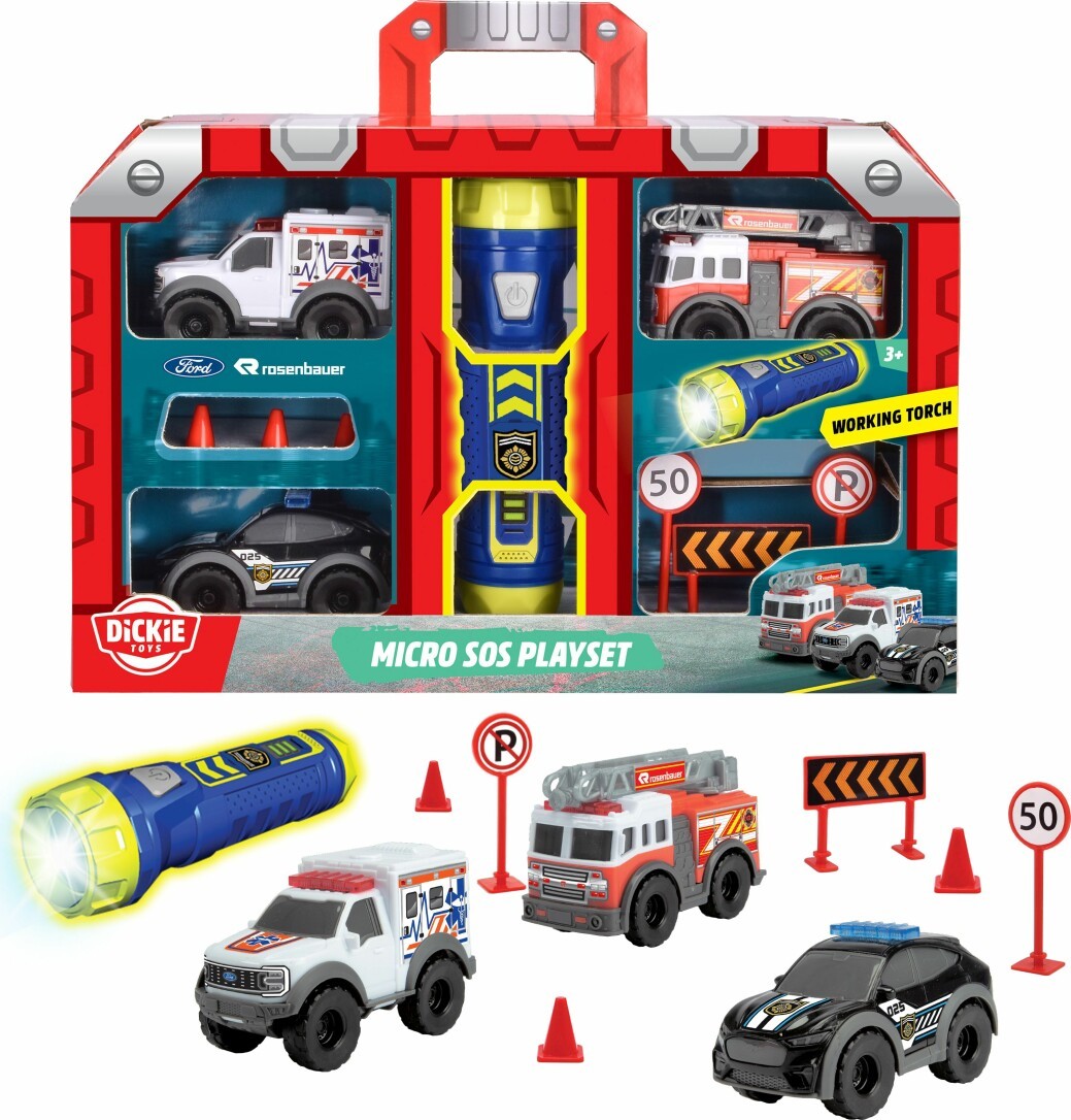 3 Micro Fahrzeuge mit Freilauf, Verkehrszeichen, 1 Taschenlampe mit 3 Lichtfunktionen (Batterien nicht enthalten), 9 cm, TB, mehrfarbig, Internationale Version