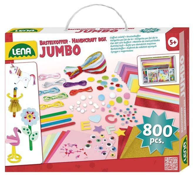 LENA® Bastelkoffer Jumbo pink enthält 17 verschiedene hochwertige Bastelmaterialien, wie z.B. glitzernde Strassteine, Knöpfe, buntes Papier, Moosgummiteile, Pfeifenreiniger, Wackelaugen, Pompons, bunte Eisstiele, Styroporkugeln, Bänder und vieles mehr in verschiedenen Pastell-Farbtönen. Insgesamt bietet der Koffer 800 Teile. Geeignet für Kinder ab 5 Jahren. Verpackt in buntem Kartonkoffer mit Produktinformationen.