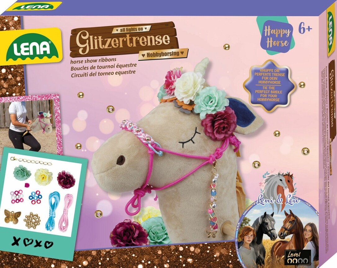 LENA® Glitzertrense Hobby Horsing. Komplettset enthält PP-Seile, Perlen, Anhänger und Kunstblumen. Mit ausführlicher, farbiger Anleitung. Für Kinder ab 6 Jahren. Verpackt in bunter Aufbewahrungsbox & Banderole mit Produktinformationen.