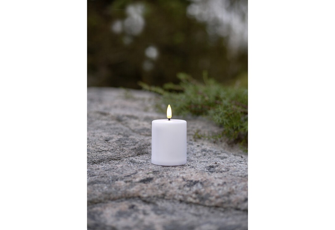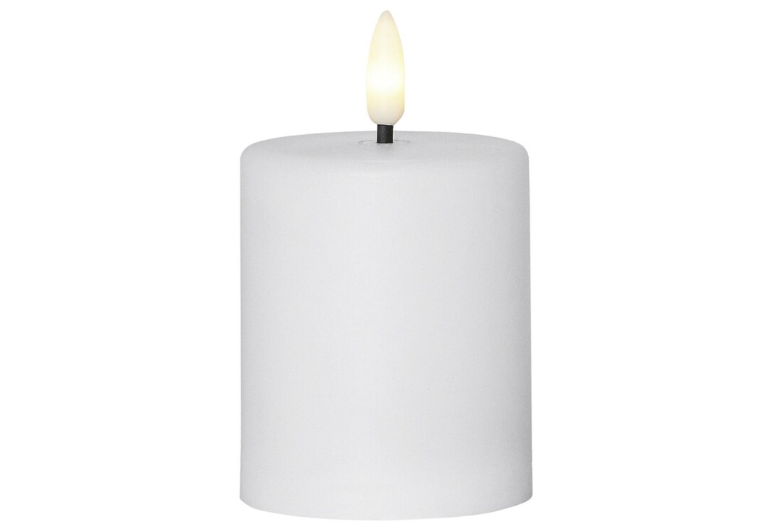 LED-Kerze "Paula" mit Licht-Sensor, flackernd, weiß, warmweiße LED, batteriebetrieben (2 Batterien C nicht im Lieferumfang enthalten. Akkulaufzeit ca. 1200h), mit Timer (6 h an 18 h aus) und Tag-Nacht-Sensor, für den Innen- und Außengebrauch geeignet. Maße: Ø 6,1 cm, H 10 cm.