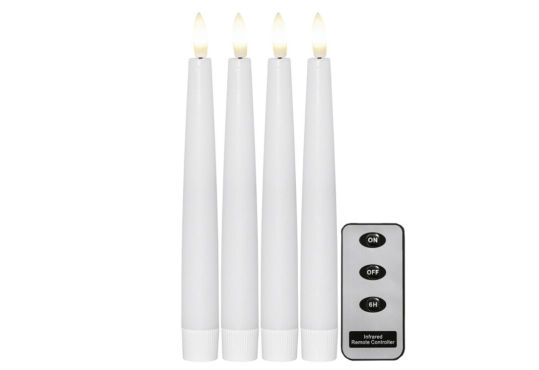 LED-Wachskerzen "Flamme" 4er Set, Farbe: weiß, warmwhite LED, ca. 20x2,1 cm, Timer, Batterie, mit Fernbedienung