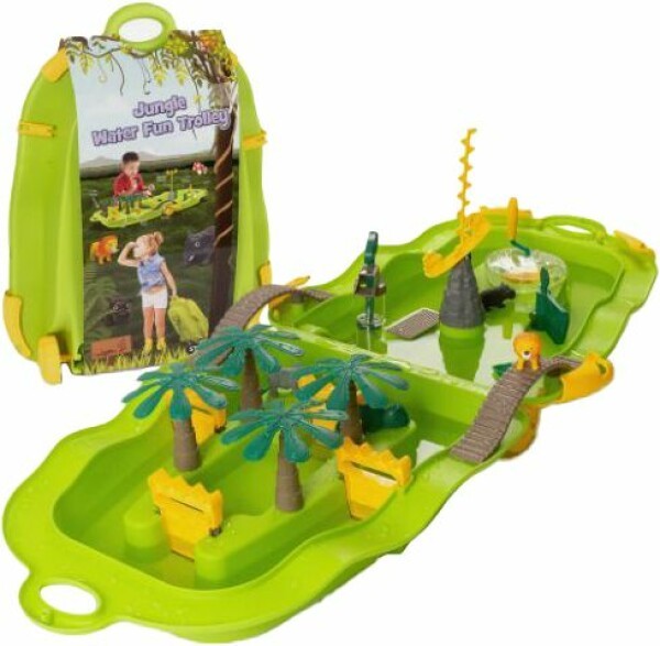 Mit dem Jungle Starplast Water Fun Trolley werden sich deine Kinder diesen Sommer keinen Moment langweilen! Diese Wasserbahn im Koffer ist ein Muss für jeden kleinen Entdecker ab 2 Jahren. Mit dem mitgelieferten Zubehör können Kinder herrlich planschen und einen Nachmittag voller Wasser und Spaß genießen. Der Jungle Water Fun Trolley ist das ideale Spielzeug für den Sommer. Er kann mit 5 Litern Wasser befüllt werden und wiegt nur 3,5 kg. Mit den verschiedenen Spielelementen wirst du einen fantastischen Tag erleben! Fahre mit dem Floß zum Gartengewächshaus, aber pass auf den Fischhaken auf, der über dir hängt. Fahre weiter durch die Schleuse und achte auf den Damm. Sei vorsichtig, wenn du unter der Brücke durchfährst, denn durch den Wellenmacher und die Wasserpumpe könnte es auf dem Wasser unruhig werden. Du bist an deinem Ziel angekommen? Dann ist es an der Zeit, die Rennstrecke auszuprobieren!