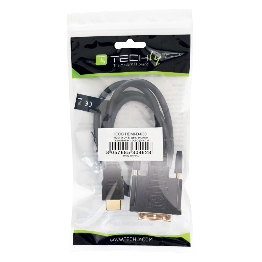 Techly 3.0m HDMI - DVI-D M/M. Kabellänge: 3 m, Anschluss 1: HDMI, Anschluss 2: DVI-D. Konformitätsbescheinigungen: CE, RoHS, Zertifizierung: CE, UL, RoHS. Gewicht: 242 g. Verpackungsart: Polybag. Menge pro Packung: 1 Stück(e)
