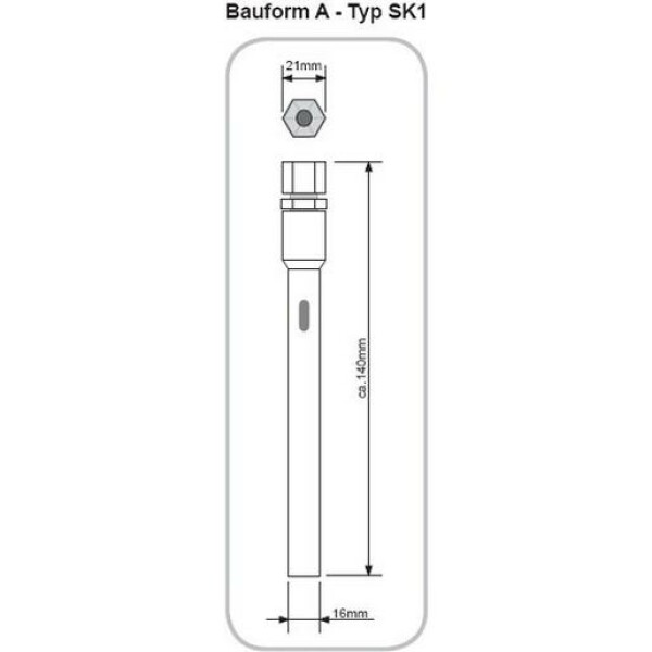 Zubehör Serie GAMMA / ENYA / TREND, Tauchelektrode aus rostfreier Edelstahl, max. Zul. Temperatur: 60°C. Tauchelektrode (Hängesonde), SK1, Niveausonde zur Erfassung von Flüssigkeitsständen in Behältern, Sondenstab aus Edelstahl, Anschlussgehäuse aus PVC, Schutzart IP44, die Tauchsonde SK1 wird direkt am Ende der Messleitung befestigt und mit dieser in die zu messende Flüssigkeit gehängt.