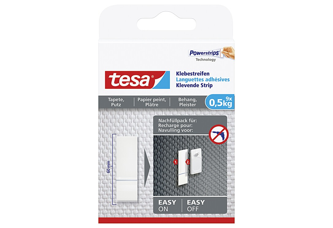 - Klebestreifen für empfindliche, strukturierte Untergründe, z.B. Tapeten * Hält Objekte bis zu 0,5kg* pro Streifen (1kg bei zwei Streifen) * Zur Wiederverwendung des Klebenagels "Tapeten & Putz" 0,5kg * Spurlos wiederablösbar