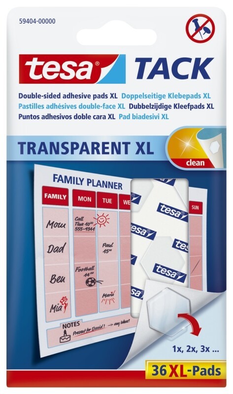 tesa® TACK Transparent Double-sided Adhesive Pads XL are removable adhesive pads that provide a clean attachment of larger paper objects to smooth and solid surfaces, such as glass, metal or plastic - in private homes or offices. Whilst the standard tesa® TACK Adhesive Pads can be used to attach rather small objects like postcards or pictures, the XL pads allows larger sheets of paper like flipcharts, year planners or poster to be hung up safely without the aid of magnets or drawing pins. The adhesive pads are convenient to use, can be removed without residues and can even be reused.