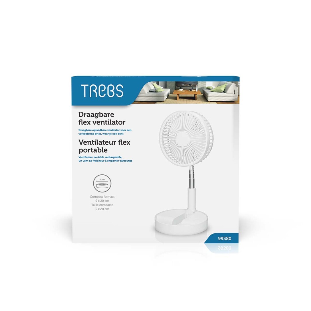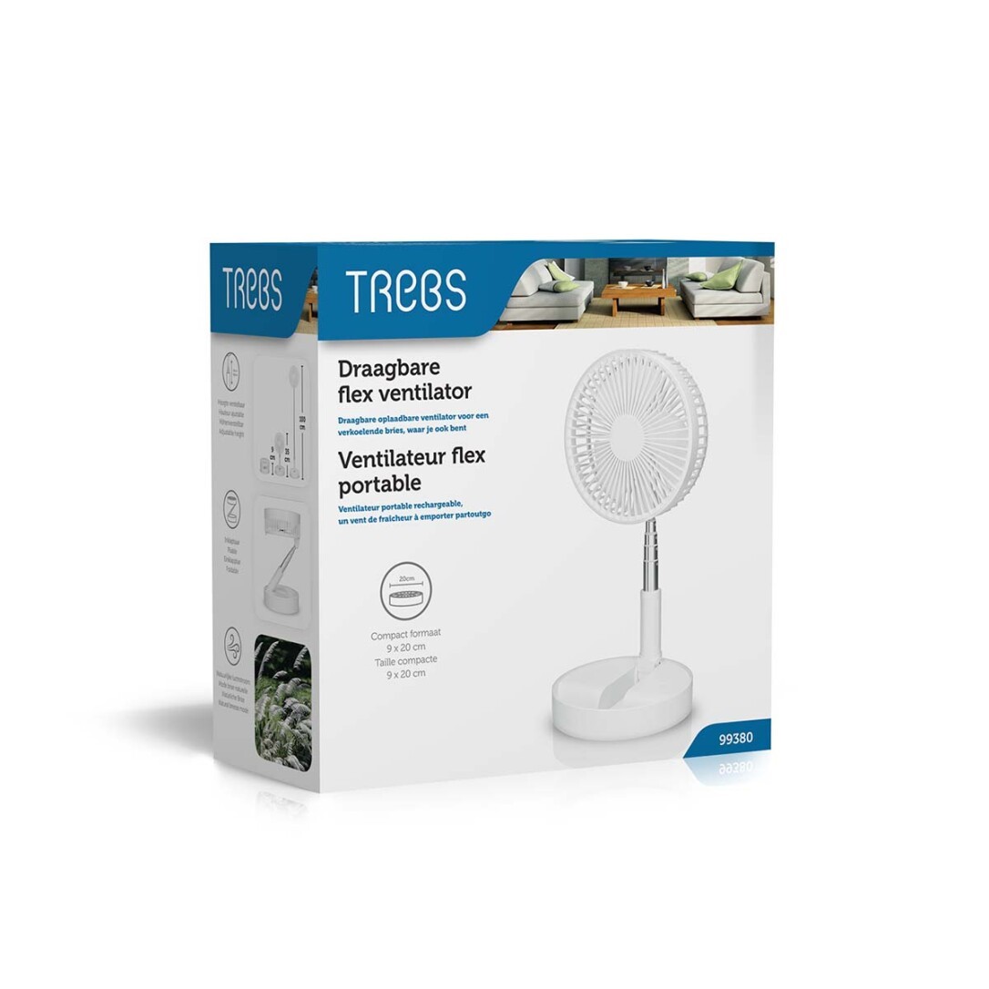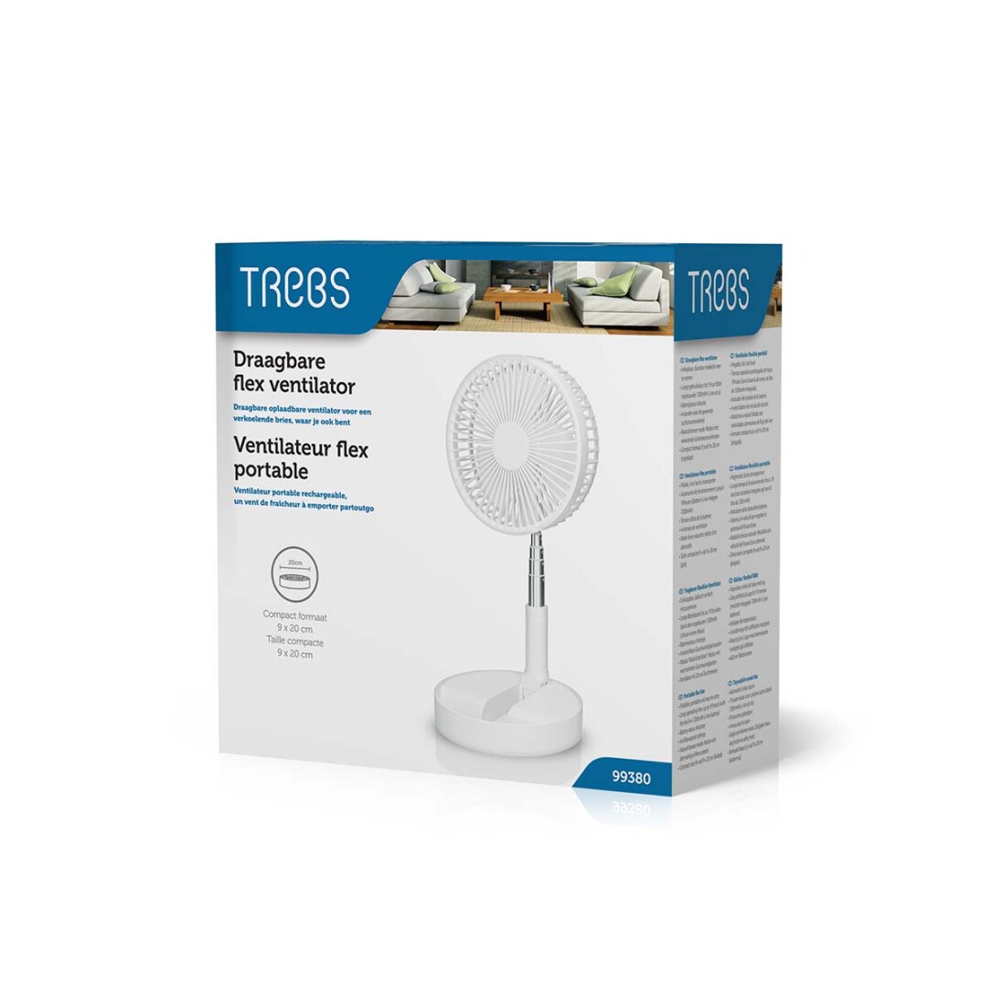 Der tragbare, wiederaufladbare Flex-Ventilator Trebs 99380 ist der perfekte Ventilator zum Mitnehmen auf die Arbeit, in den Urlaub oder einfach für den Einsatz in Ihrem Zuhause. Der Ventilator hat einen leistungsstarken Motor und sorgt für eine kühlende Brise, wo immer Sie sind.Äußerst vielseitigDer Trebs 99380 ist ein 2-in-1 Tisch- und Standventilator. Verstellbar in der Höhe von 35 cm bis zu einem Meter, kann dieser Ventilator sowohl auf dem Tisch als auch auf dem Boden verwendet werden. Der Ventilator hat einen Durchmesser von 20 Zentimetern, ist vollständig zusammenklappbar und kann in verschiedene Positionen gedreht werden. Dieser kabellose Ventilator ist tragbar, faltbar und ideal zum Mitnehmen an Orte, an denen Sie etwas Abkühlung gebrauchen können. Zusammengeklappt misst der Ventilator nur 9 x 20 cm und passt sogar in einen kleinen Rucksack oder Picknickkorb!Leistungsstarker Motor für bis zu 19 Stunden BetriebsdauerDer Trebs 99380 Flex-Lüfter verfügt über einen leistungsstarken 7200mAh Li-Ion-Akku. Dadurch kann der Trebs 99380 nach dem Aufladen bis zu 19 Stunden lang kabellos betrieben werden. Der Lüfter ist über das mitgelieferte USB-Kabel wieder aufladbar.4 LuftstromeinstellungenEs gibt drei Luftstromeinstellungen und eine Einstellung für eine natürliche Brise. In diesem variablen Modus wechseln sich die Luftstromgeschwindigkeiten automatisch ab und erzeugen eine natürliche, erfrischende Brise.Der Trebs 99380 hat eine schlichte weiße Farbe und ist mit rutschfesten Füßen an der Unterseite ausgestattet. So steht der Ventilator fest auf Ihrem Schreibtisch, während Sie ihn bedienen!Lieferumfang• Tragbarer Ventilator