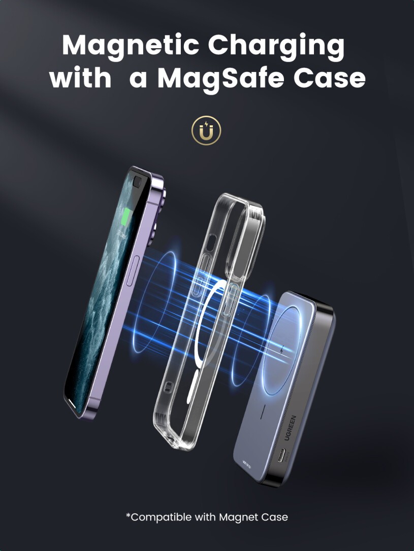Diese Powerbank lässt sich mit MagSafe ganz einfach magnetisch am iPhone der Serien 12 bis 15 befestigen, um es aufzuladen. Dank des starken Magneten (10N) kann das iPhone auch während des Ladevorgangs verwendet werden.