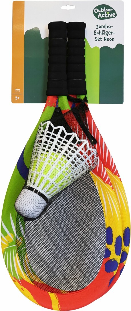 Outdoor active Jumbo-Schläger Set, Länge 67cm. Bestehend aus zwei Schlägern mit Textilbespannung und Schaumstoffgriffen aus hochwertigem Material sowie einem Softtennisball und Federball. Auf Pappkarte. Maße ca. 67x29,50x2,80 cm. Für Kinder ab 5 Jahren.