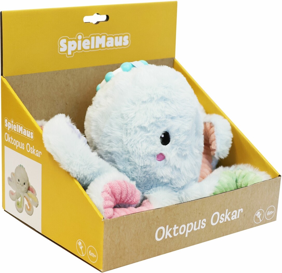 Der SpielMaus Baby Oktopus mit seinen farblich verschiedenen Fangarmen lädt zum Spielen und Kuscheln ein. Mit Ring zum Aufhängen. Aus 100% Polyester. Maße ca. 29x32x15 cm. Für Kinder ab 6 Monaten.