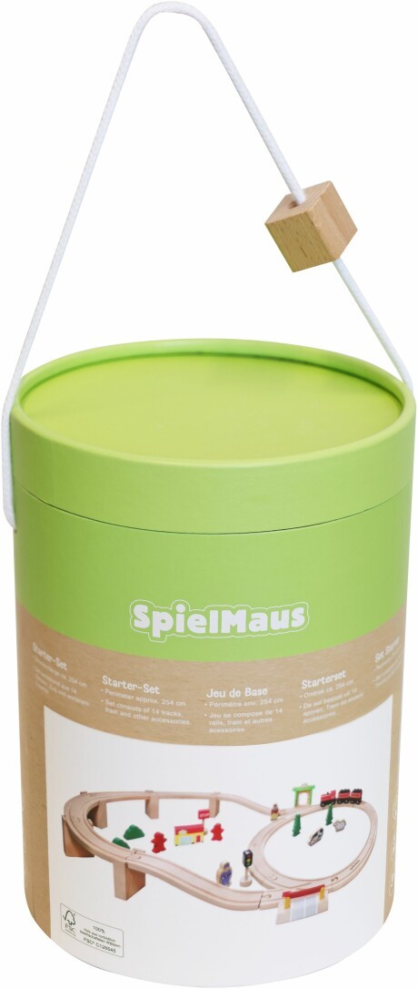 SpielMaus Holz Holzeisenbahn in Trommel, 38-teilig. Bestehend aus Kurven und Geraden, Bahnübergang, Zug mit 2 Waggons, Bahnhofshäuschen, Haus, 4 Bäumen, Spielfiguren, Tieren und vielem mehr. Maße ca. 82,5x45,5x7,5 cm. Für Kinder ab 3 Jahren.
