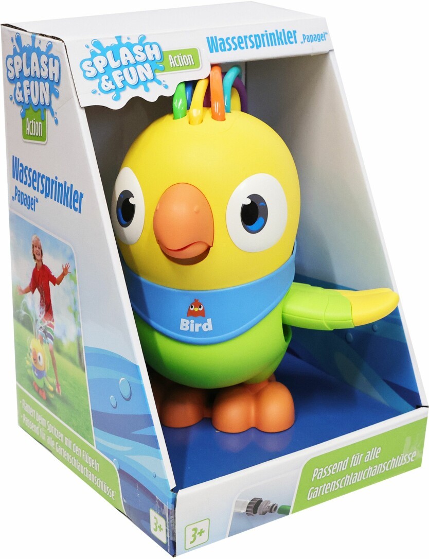 Der Splash und Fun Wassersprinkler Papagei ist ein lustiger Begleiter für heiße Sommertage. Die Füße und Flügel bewegen sich auf und ab. Dazu bewegen sich die Schläuche hin und her. Passend für alle handelsüblichen Gartenschlauchanschlüsse. Maße ca. 18,5x18x26 cm. Für Kinder ab 3 Jahren.