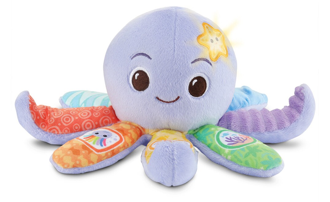 Niedlicher Meeresbewohner zum Drücken! Interaktiver Oktopus aus Plüsch mit farbenfrohen und weichen Tasten, unterschiedlichen Ober- flächen und Materialien zum Entdecken und Spielen. 3 Spielmodi: Naturmodustaste (beruhigende Wassergeräusche), Musiktaste (löst Melodien, Geräusche und Lieder aus) und Sprachtaste (löst Sätze aus). Der Seestern am Kopf leuchtet in verschiedenen Farben. Die 8 bunten Tentakel bestehen aus unterschiedlichen weichen Materialien, die zum Erkunden einladen. Lerninhalte: Musik & Geräusche, taktile Wahrnehmung, Förderung der auditiven Wahrnehmung und Farben. 3 gesungene Lieder und 15 Melodien. Kindersicheres Batteriefach, Abschaltautomatik und Lautstärkeregler. Demobatterien sind enthalten.