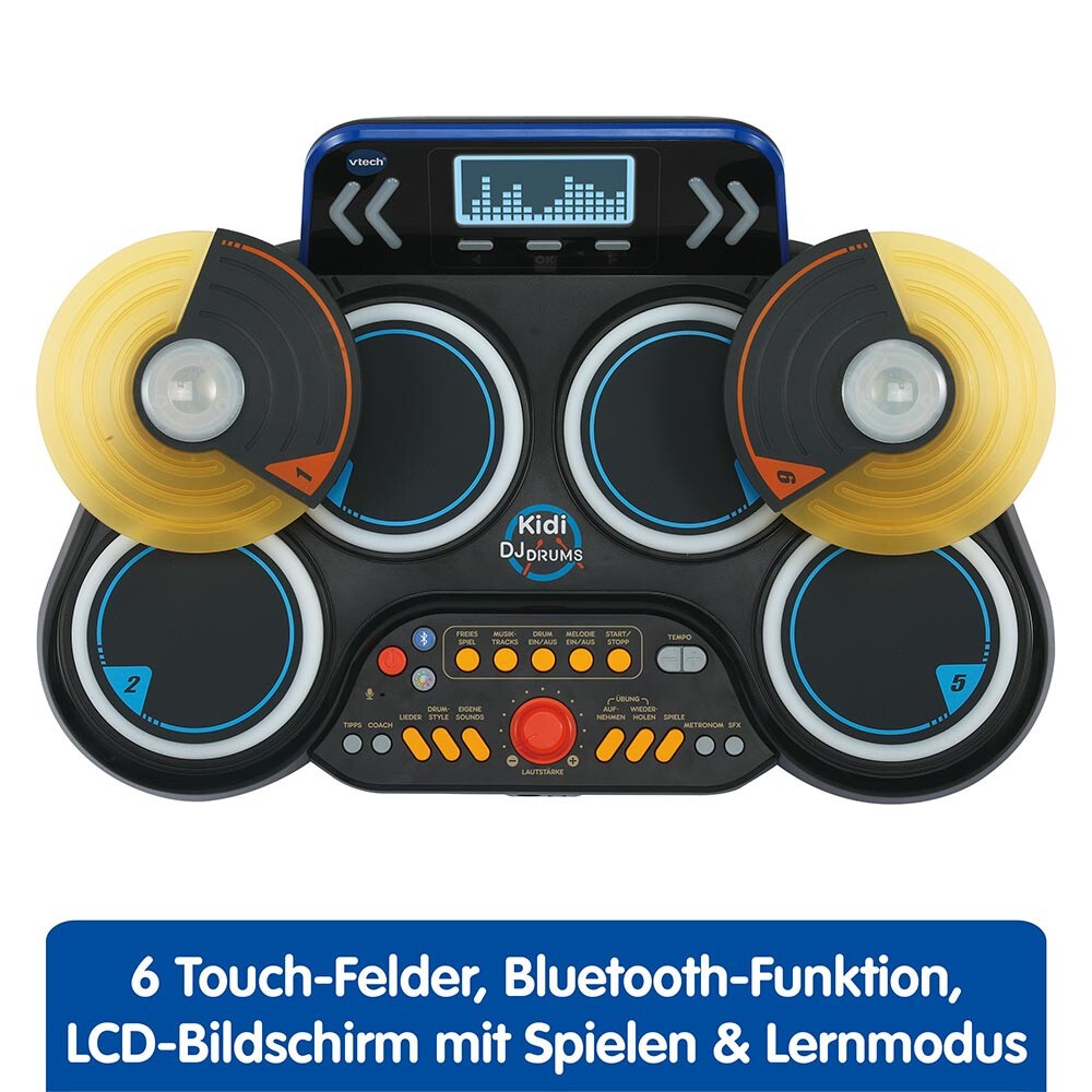 Den eigenen Beat finden - mit den Kidi DJ Drums! Elektronisches Schlagzeug mit coolen Leuchteffekten und realistischen Schlagzeuggeräuschen. 8 Spielmodi: Bühne frei (freies Spiel, Musik und verschiedene Einstellungen), Schlagzeugeinstellungen, Aufnahmestudio (eigene Kompositionen aufnehmen und wieder abspielen), Lernmodus (Rythmusgefühl trainieren und spannende Fakten übers Schlagzeugspielen lernen), Spiele (3 musikalische Spiele), Lieder anhören, Soundeffekte abspielen und Klickspur (konstantes Tempo mit Hilfe der Klickspur im freien Spiel einhalten). 6 Touch-Felder mit 4 Trommelflächen und 2 Becken, die in coolen Farben leuchten und Neonlichteffekte auslösen. Das Tippen auf die Trommelflächen löst realistische Trommelgeräusche aus. Lerninhalte: Musik, Kreativität und auditive Wahrnehmung. Mobilgeräte via Bluetooth verbinden und die eigene Lieblingsmusik hören. Mit eingebautem Lautsprecher, Mikrofon, Netzsteckerbuchse, Kopfhöreranschluss und inkl. 2 Drumsticks. LCD-Display mit Beleuchtung. 6 gesungene Lieder, 30 Melodien und 120 Schlagzeug-Geräuscheffekte sind vorinstalliert. Kindersicheres Batteriefach, Abschaltautomatik und Lautstärkeregler. Demobatterien sind enthalten.