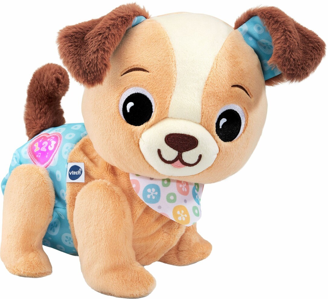 Gemeinsam mit dem niedlichen Hundefreund krabbeln! Mit dem süßen Hündchen krabbeln lernen und Spaß haben. Drückt man auf die leuchtende Herztaste am Rücken des Hündchens, werden Sätze, Lieder, Melodien sowie Geräusche abgespielt und das Licht blinkt passend dazu. Das Hündchen animiert die Kleinen mit liebevollen Sätzen dazu, ihm hinterherzukrabbeln. Weicher Plüschstoff. Bewegt die Öhrchen. 4 motorisierte Beinchen zum Krabbeln: während das Hündchen krabbelt, leuchtet die Herztaste. 3 gesungene Lieder und 15 Melodien. Kindersicheres Batteriefach, Abschaltautomatik und Lautstärkeregler.