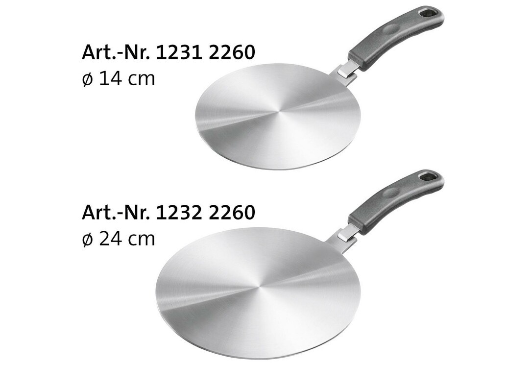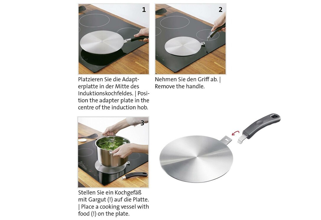 | Artikeleigenschaften | Für nicht-magnetische Töpfe und Pfannen|Abnehmbarer, wärmeisolierter Griff|für Kochgeschirr aus Aluminium, Edelstahl, Emaille, Gusseisen, Glaskeramik, Keramik etc|spülmaschinengeeignet|Material: Rostfreier Edelstahl, Aluminium, VSK |