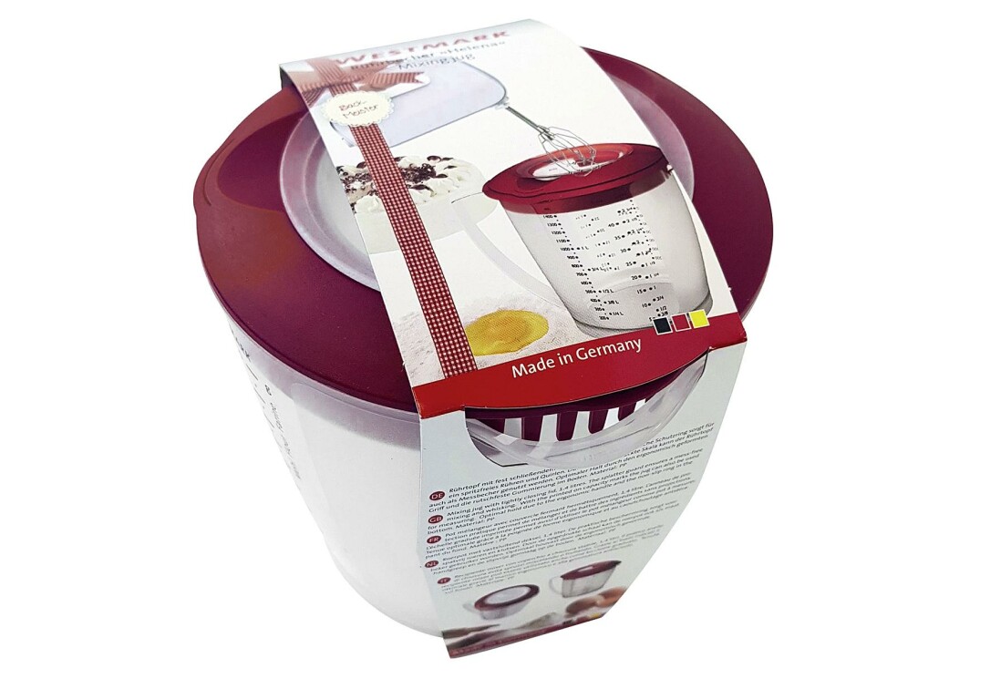 Der Rührbecher "Helena" kommt von der Marke Westmark und ist zweifarbig gehalten. Mit den Maßen von 19,5 cm Länge, 15 cm Breite und 14,8 cm Höhe bietet der Rührbecher genug Raum für 1,4 l Inhalt. Aus Kunststoff gefertigt, ist er weder für die Mikrowelle noch für das Induktionsfeld geeignet. Dafür lässt er sich in der Spülmaschine reinigen und überzeugt durch Lebensmittelechtheit. Der Becher kommt im 3er-Pack mit zwei Deckeln.
