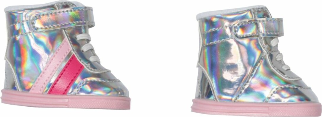 'BABY born tritt ins Spektrum der coolsten Schuhe ein. Man sieht die holographischen Stiefelchen schon von Weitem funkeln. Seitlich sind die trendigen Treter mit Streifen in pink und rosa verziert. Gut verschnürt und mit Klettverschluss befestigt, kann BABY born damit bis zum Mond laufen. Hochwertige Kleidung für die BABY born Markenspielpuppe. Für erweitertes, abwechslungsreiches und langanhaltendes Spielvergnügen. Kinderleichtes An- und Ausziehen. BABY born Sneakers pink 43cm.''