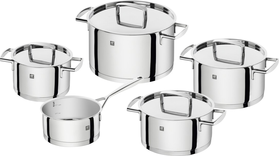 Das fünfteilige Kochgeschirrset von ZWILLING eignet sich für die Verwendung auf Gas- und Elektrokochfeldern und sogar für Induktionskochplatten. Es ist spülmaschinengeeignet und damit sehr pflegeleicht. Die ergonomisch geformten Griffe aus Edelstahl erleichtern das Handling. Mit diesen Töpfen kochen Sie daher mühelos, worauf immer Sie gerade Appetit haben, und verwöhnen sich und Ihre Familie.
